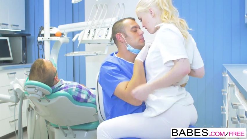 Вколов наркоз очередному пациенту, стоматолог убедился, что он подействовал и незнакомец сладко уснул в кресле. В этот момент в кабинете появилась личная ассистентка Миша Кросс и супер коротком халате. Решительно рванув рукой к девушке под одежду, врач нащупывает отсутствие на ней нижнего белья и гладкие половые губы. Прямо за спиной спящего клиента, доктор и его блондинистая помощница предаются сиюминутному порыву сексуальной страсти и занимаются безумно бурным сексом, позабыв про насущные проблемы. Не смотря на то, что женатый, врач смело спустил сперму в вагинальной отверстие, тем самым оплодотворяя его.