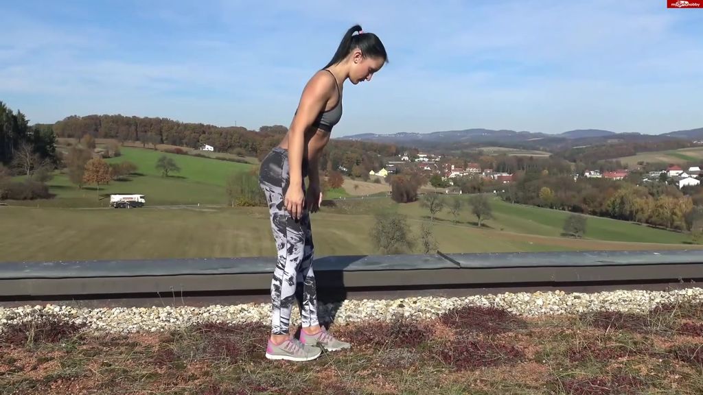 Девушка со своим парнем занимались утренней разминкой как обычно, но через какое то время им пришла в голову дурная мысль и вот уже спортсмены трахаются на крыше своего дома с прекрасным видом. Девушка была на столько гибкая что она задирала так круто свои ноги, что парню ничего не оставалось делать как только подставлять свой член и получать удовольствие. Партнеры еще больше возбуждались от каждой новой позы из за прекрасного вида который открывался с их места.